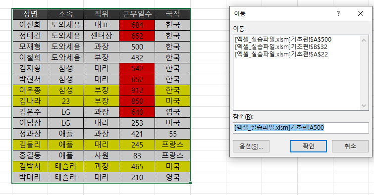 이동 단축키 = F5 누르고, 이동하고 싶은 셀 이름 작성
