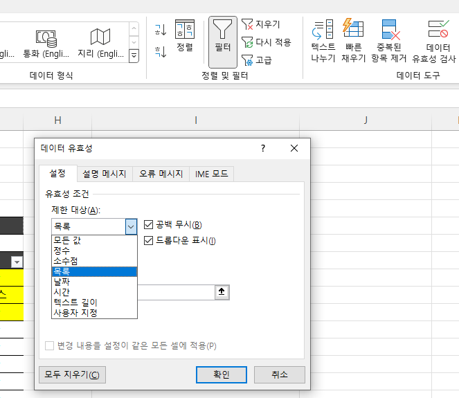 셀 범위를 설정하여 데이터 유효성 검사에서 목록을 만들어 원본 적용한다.